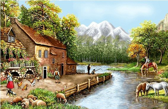نخ و نقشه تابلو فرش طرح کلبه کنار رود (کد A1015)
