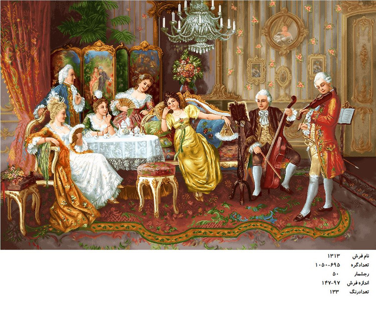 نخ بکار رفته در تولید نخ و نقشه این طرح از نخ مرینوس 2 لای درجه 1 میباشد .که دارای بالاترین درجه کیفی از جهت رنگ پذیری و عدم رنگ دهی نخ بعد از رنگرزی را داراست و همچنین ابریشم ها بصورت ابریشم بافت طبیعی است.